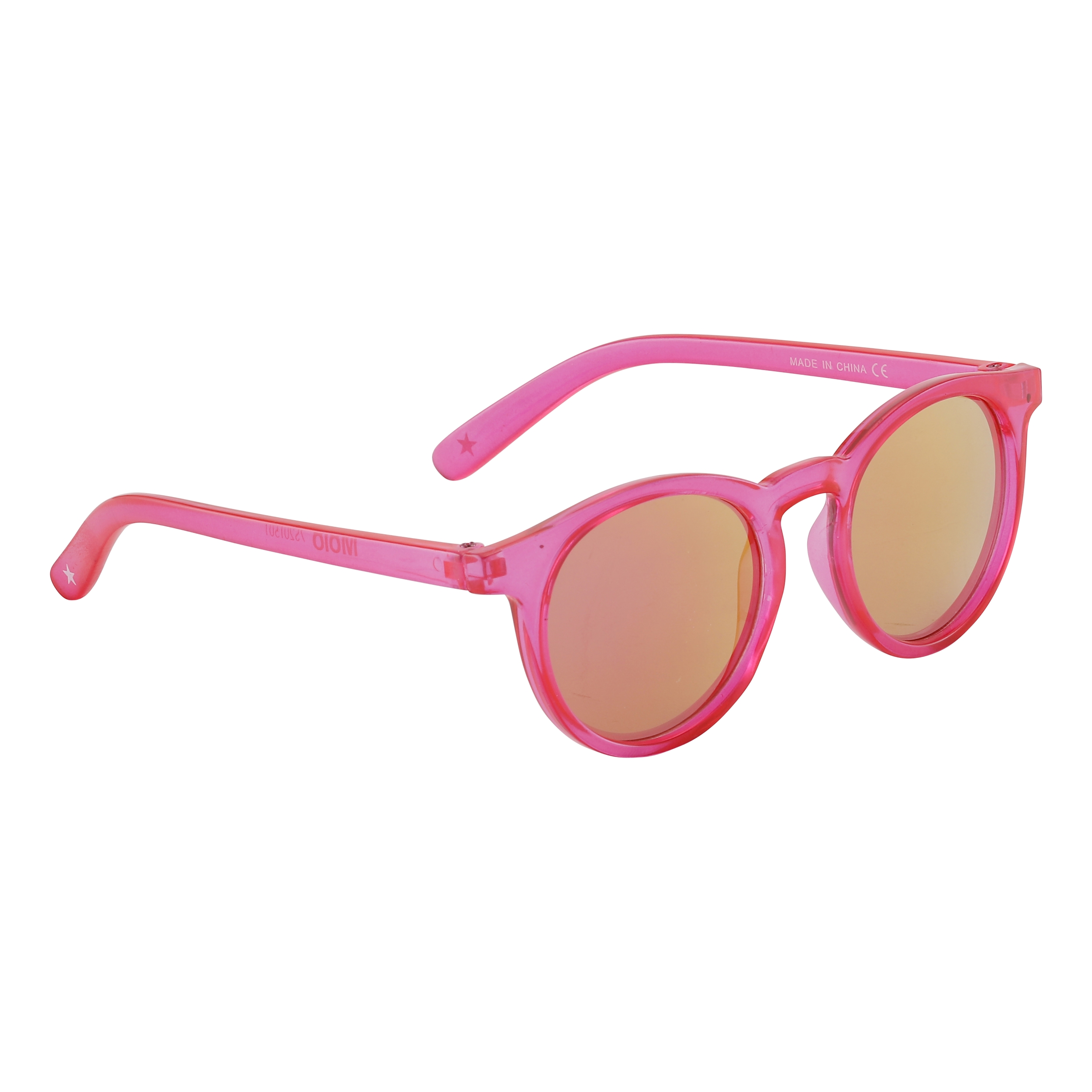 Round, pink sunglasses with light lenses. Molo's sunglasses have 100% UV protection.