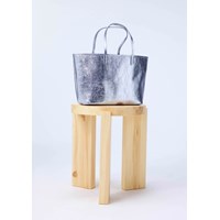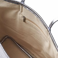 Large silver shopper bag. The bag measures 42 cm in width at the top, and 30 cm at the bottom, and is 42 cm high, including the handles. The bag has a large interior space, as well as a small pocket with a zipper and cotton lining.