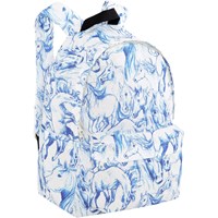 White backpack with a print of blue, hand sketched horses. The backpack has plenty of space for books, binders, pencil case, lunch box and a padded sleeve that can fit a laptop or tablet. It has a front zip pocket for easy access, bottle pockets on both sides, padded back and shoulder straps, and an adjustable chest strap that helps distribute the weight evenly. Dimensions: 30 x 17 x 42. Volume: 21L.