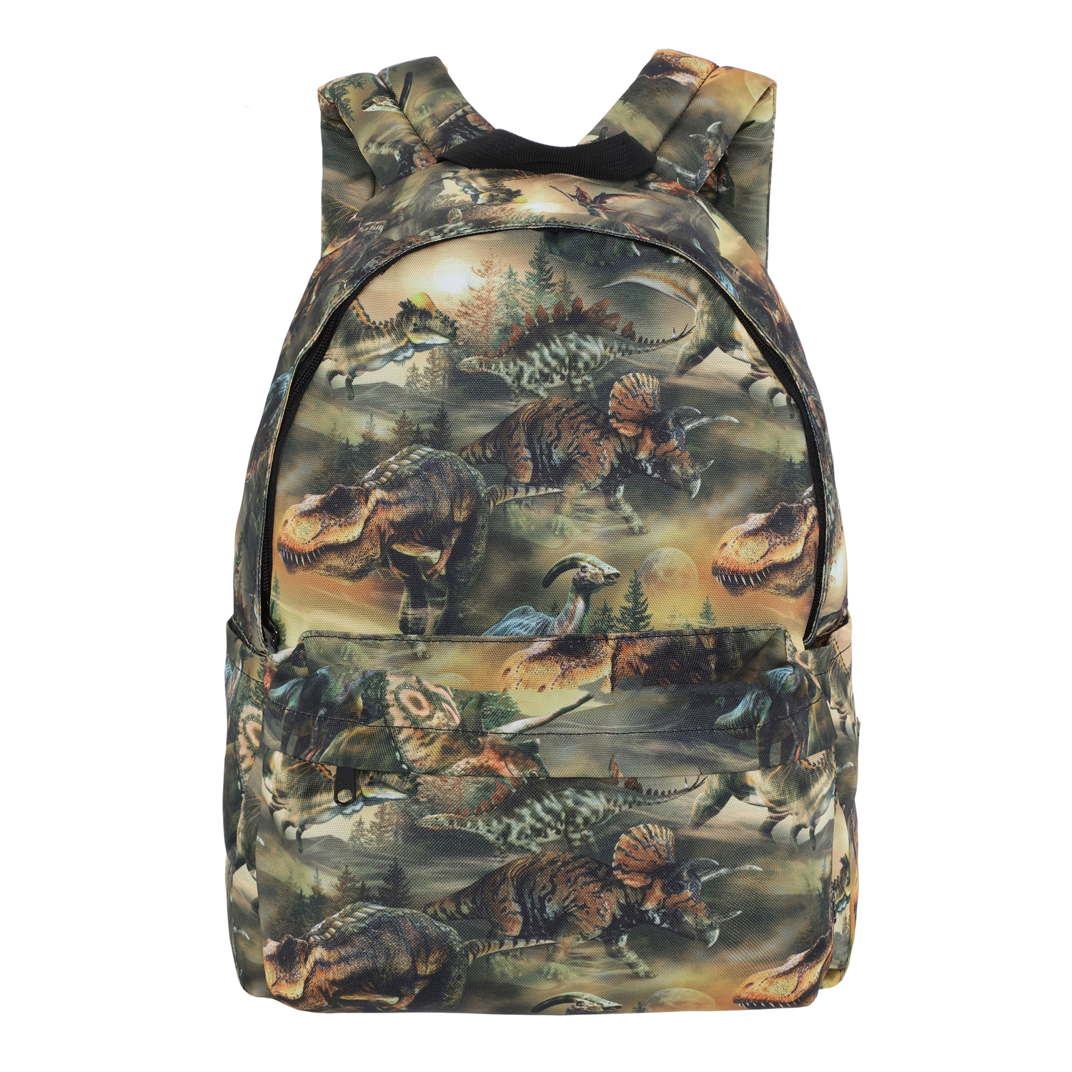 Backpack with a print of dinosaurs. The backpack has plenty of space for books, binders, pencil case, lunch box and a padded sleeve that can fit a laptop or tablet. It has a front zip pocket for easy access, bottle pockets on both sides, padded back and shoulder straps, and an adjustable chest strap that helps distribute the weight evenly. Dimensions: 30 x 17 x 42. Volume: 21L.
