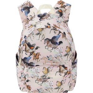 Pink backpack with a print of galloping horses with butterfly wings. It is spacious and offers plenty of room, including a padded compartment to protect your laptop or tablet. Additionally, it features a zippered front pocket, bottle pockets on both sides and padded back and shoulder straps. It also has an adjustable chest strap that helps evenly distribute the weight. Dimensions: 30 x 17 x 42. Volume: 21L.