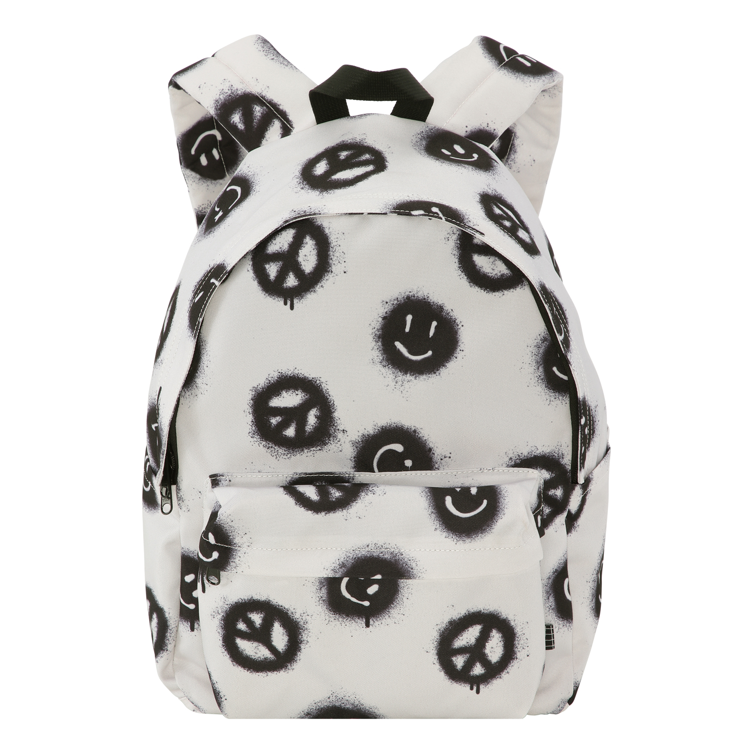 Backpack in off-white with a print of peace signs and smiley faces. It is spacious and offers plenty of room, including a padded compartment to protect your laptop or tablet. Additionally, it features a zippered front pocket, bottle pockets on both sides and padded back and shoulder straps. It also has an adjustable chest strap that helps evenly distribute the weight. Dimensions: 30 x 17 x 42. Volume: 21L.