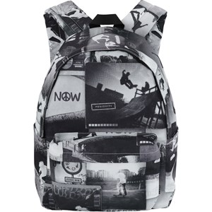 Backpack in black and white with a collage print of cool skaters. It is spacious and offers plenty of room, including a padded compartment to protect your laptop or tablet. Additionally, it features a zippered front pocket, bottle pockets on both sides and padded back and shoulder straps. It also has an adjustable chest strap that helps evenly distribute the weight. Dimensions: 30 x 17 x 42. Volume: 21L.