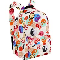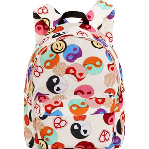 Beige backpack with a multi-coloured, all-over yin/yang print. It is spacious and offers plenty of room, including a padded compartment to protect your laptop or tablet. Additionally, it features a zippered front pocket, bottle pockets on both sides and padded back and shoulder straps. It also has an adjustable chest strap that helps evenly distribute the weight. Dimensions: 30 x 17 x 42. Volume: 21L.