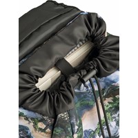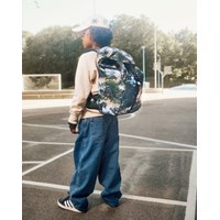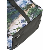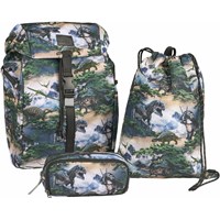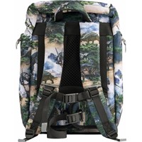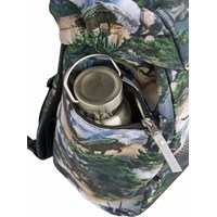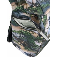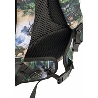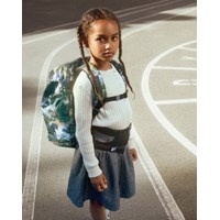 Greengrey school bag with dinosaur landscape print in durable polyester with a water-repellent surface. The bag has an adjustable chest strap and hip belt for optimal weight distribution, as well as padded shoulder straps, back panel, and hip pads for comfort. It is equipped with a practical hanging loop, a sturdy lid with front closure, and two side pockets with zips, one of which is lined with thermal insulation material for storing items like a water bottle. The main compartment can be cinched at the top and contains three elastic inner pockets for organisation, as well as a foam-padded pocket for extra protection of electronics or books. The bag also has reflectors on all external zips and straps for increased visibility in traffic. Dimensions: 40 x 15 x 28. Volume: 20L.