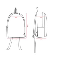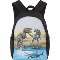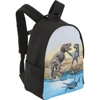 Black backpack with a dinosaur print on the front. It is spacious and offers plenty of room, including a padded compartment to protect your laptop or tablet. Additionally, it features bottle pockets on both sides and padded back and shoulder straps. It also has an adjustable chest strap that helps evenly distribute the weight. Dimensions: 30 x 17 x 42. Volume: 21L.
