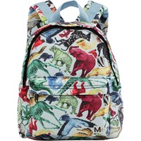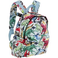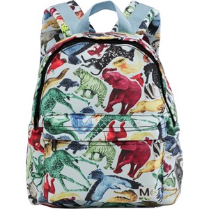 Light blue rucksack with various colourful animals. It has an exterior pocket, a buckle on the chest, a loop and adjustable straps.