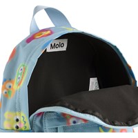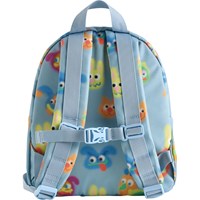 Blue backpack for children aged 3-6 years with a funny characters print. It has one large compartment, front zip pocket, padded back and shoulder straps, and adjustable chest strap for optimal comfort. Dimensions: 26 × 10 × 30 cm. Volume: 7.5 L.