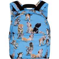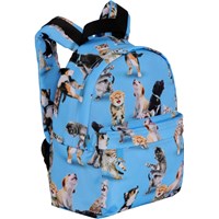 Blue backpack with print of cats and dogs. The backpack has a large compartment and a front zipper. It has a padded back and shoulder straps as well as an adjustable chest strap for extra comfort. Dimensions: 26 x 10 x 30. Volume: 6,5L.