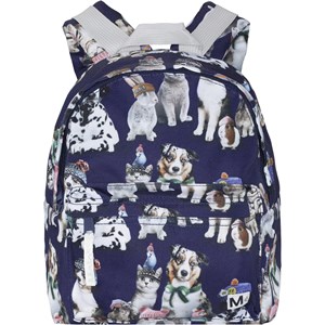 Backpack in blue with a print of various animals, wearing headbands and hats. This backpack is perfect for little adventurers aged 3-6 years, with a main compartment and a practical zippered front pocket. The bag features padded back and shoulder straps and an adjustable chest strap for optimal comfort. It is ideal as a preschool bag and can grow with the child thanks to the adjustable straps. Dimensions: 26 x 10 x 30 cm. Volume: 6.5L.