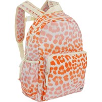 Roomy rucksack in orange and rose coloured striped jaguar print on a cream coloured background. The rucksack is constructed in a recycled polyester. It has an exterior front pocket with a zipper and pockets at both sides for, e.g., a bottle of water. The rucksack has a padded back, a loop, adjustable straps. and an inner pocket. This Molo product is recycled and made from reusable polyester, which is produced from plastic bottles and other waste materials. The production of recycled polyester requires fewer resources and emits less CO2, making Molo’s recycled rucksack the sustainable choice. The rucksack measures 17cm. x 39cm. x 32cm.