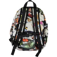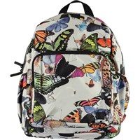 Roomy rucksack with a butterfly print. It has an exterior front pocket with a zip closure, side pockets for, e.g., a water bottle, padded back, loop and adjustable straps.