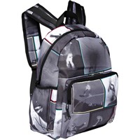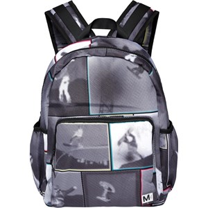 Roomy rucksack in grey with a print of snowboarder. It is constructed in recycled polyester. The rucksack has an exterior front pocket with a zip closure, side pockets for, e.g., a water bottle, padded back, loop and adjustable straps.