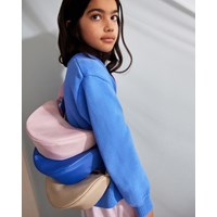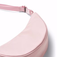 Pink bag with a half-moon shape and adjustable shoulder strap, allowing it to be worn over the shoulder, chest, or crossbody. The bag has a main compartment and closes with a zipper. Dimensions 24 x 14 x 8.