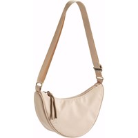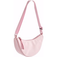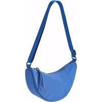 Blue bag with a half-moon shape and adjustable shoulder strap, so it can be worn over the shoulder, chest, or crossbody. The bag has a main compartment and closes with a zipper. Dimensions 24 x 14 x 8.