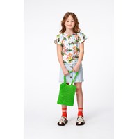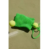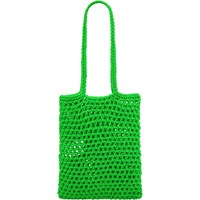 Small, green shoulder bag, crocheted in robust, polyester yarn. It is unlined and has an open top with a shoulder strap. Dimensions: 21 cm wide and 25 cm tall.