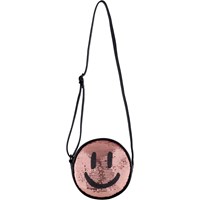 Black and pink crossbody bag with a sequined smiling face on the front. The bag has an adjustable shoulder strap.