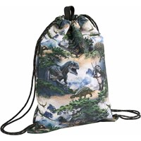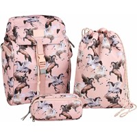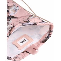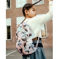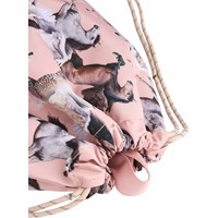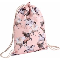 Pink gym bag with a print of flying pegasi, made from durable polyester with water-repellent properties. The bag has a reflective drawstring closure that also serves as shoulder straps. At the top, it is equipped with a hanging loop and a small inner pocket for a name tag.
