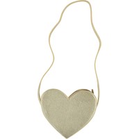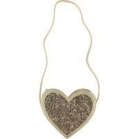 Gold-coloured crossbody bag in a heart shape with a lot of glitter. It has an adjustable shoulder strap.