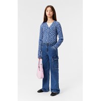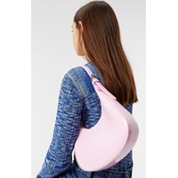 Pink shoulder bag with curved shape, glossy finish, zipper, and adjustable strap.