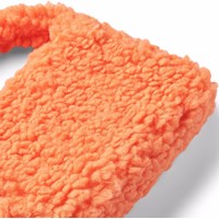 Orange bag in fluffy teddyfleece. The bag measures 24 cm in width and 18 cm in height in the middle without a strap. The bag has matching lining and a small pocket.