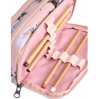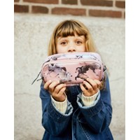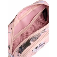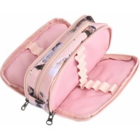 Practical pink pencil case with a print of flying pegasi. The pencil case is made of durable polyester and has three zippered compartments: two designed for organising writing tools and one larger compartment with a side pocket for storing small items.