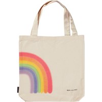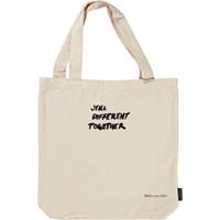 This is a white tote bag with a print of a rainbow on one side and a text of ''Still different together'' on the other side.