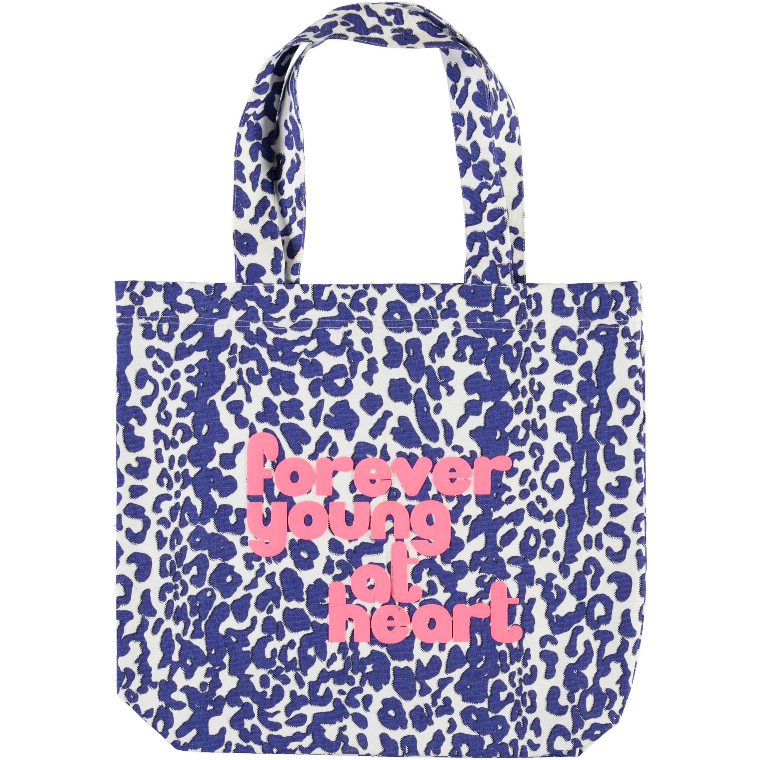 Totebag in a blue leopard print with the text 'Forever young at heart' on the front.
