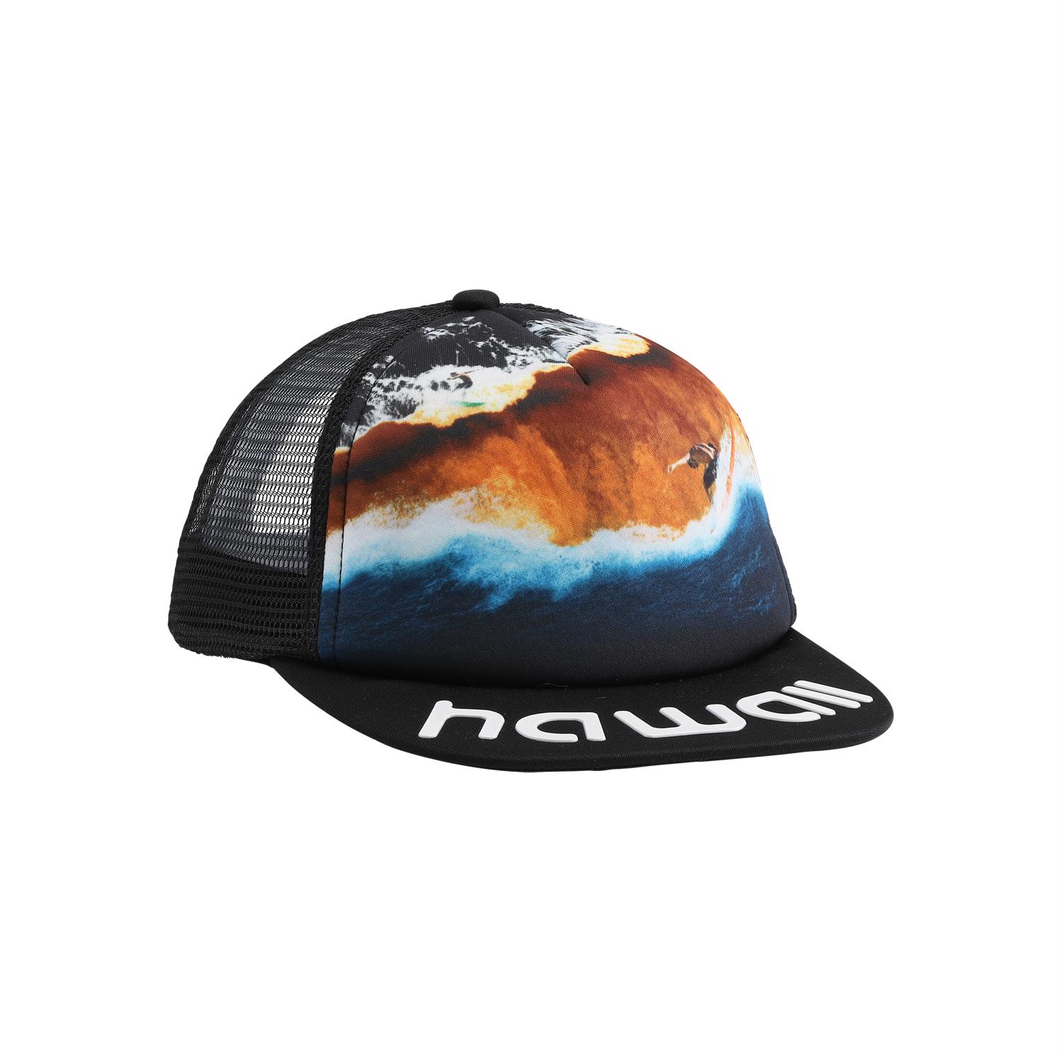 Cool cap with a print of surfers and large waves as well as the text 'Hawaii' on the visor. The cap has a net back and is adjustable in the back.