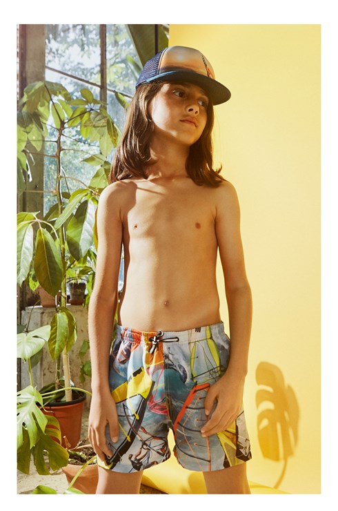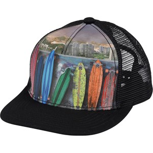 Black cap with a straight visor and adjustable in the back. The cap has a surfboard print on the front.