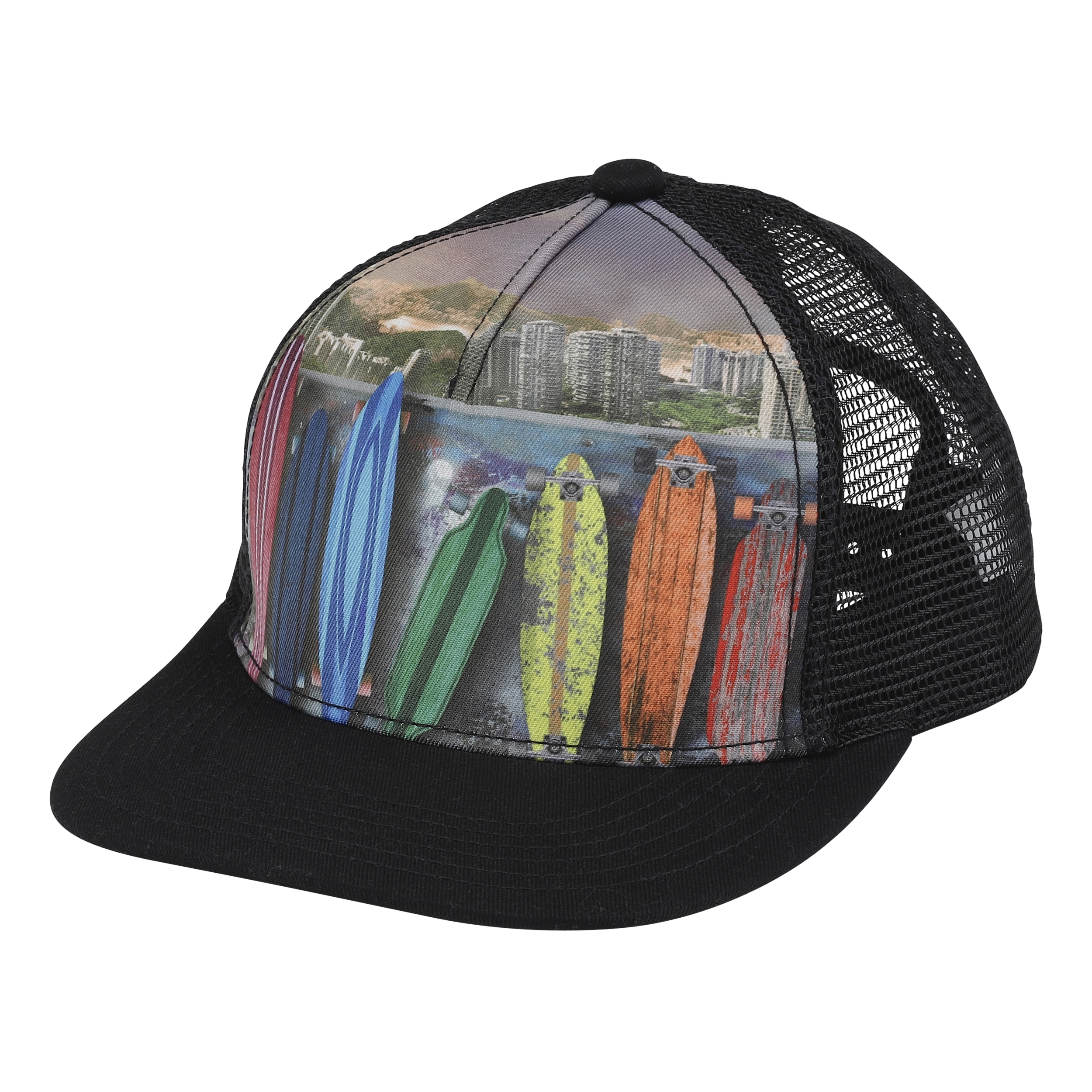 Black cap with a straight visor and adjustable in the back. The cap has a surfboard print on the front.