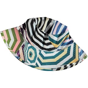 Bucket hat with a wide brim and a UV protection of 50+. The bucket hat has a colourful parasol print. It isn't just for protection; it is also a necessary summer accessory.