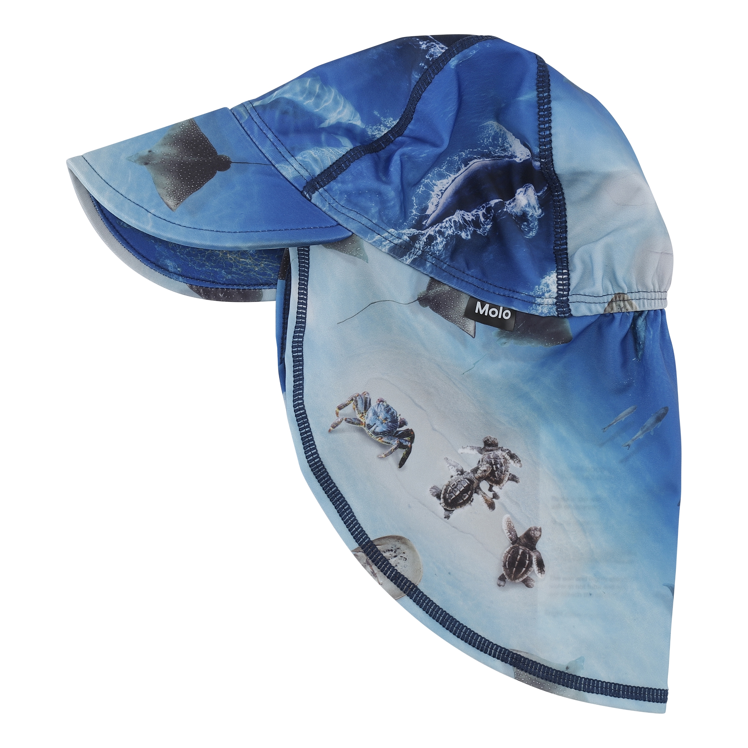 Sunhat with 50+ UV protection, a wide brim and long in the back of the neck for extra protection. The sunhat has the 'Above Ocean' print.