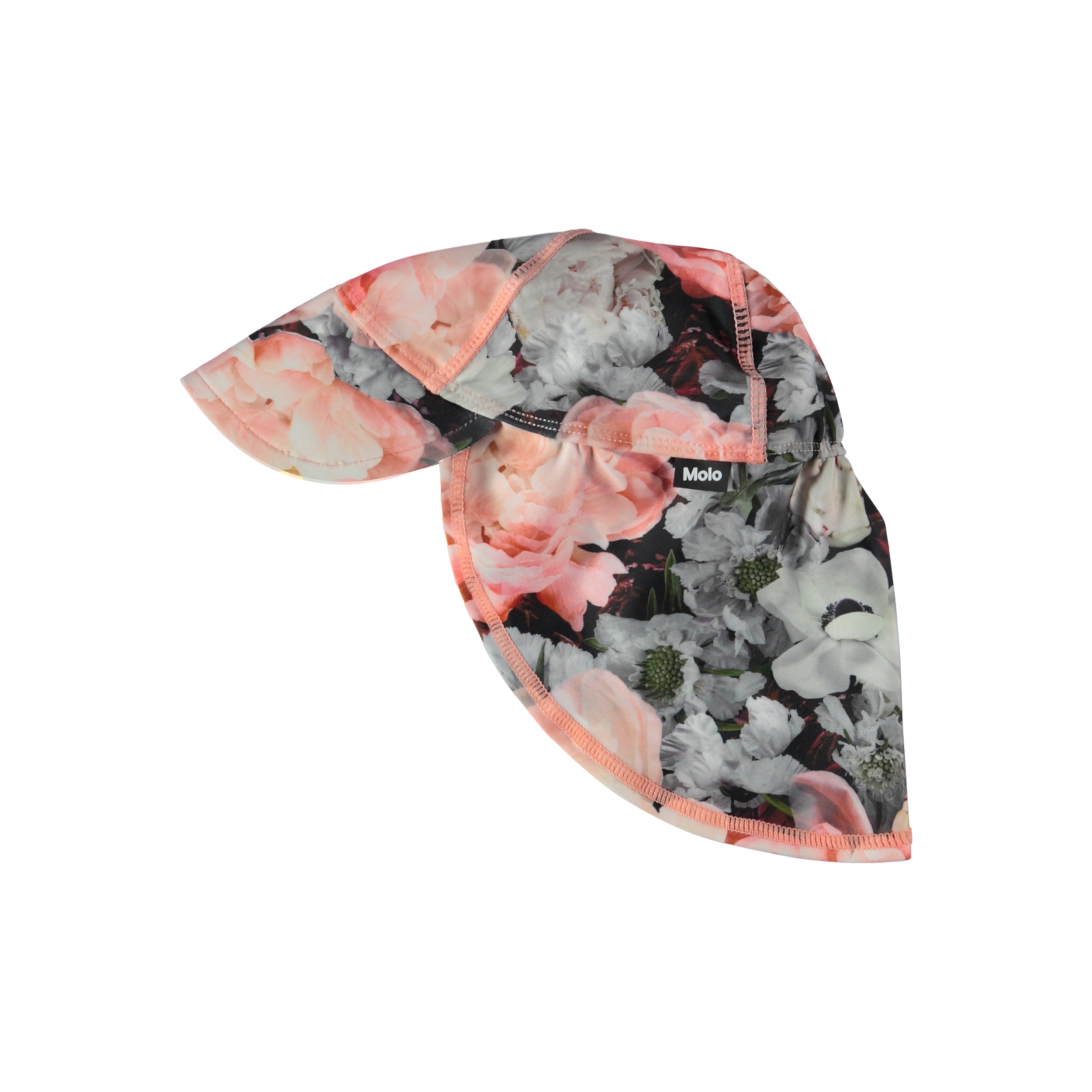 Sunhat with a UV protection of 50+. It has a wide brim and is longer in the back to give extra protection. The hat is decorated with a flower print.