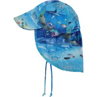 Green sun hat for small children made from 85% recycled polyester. It has a happy, smiling face with palm tree eyes on the front. The hat has a practical tie, 50+ UV protection and is slightly longer in the back for optimal sun protection for the neck.