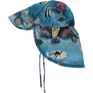 Sun hat with 50+ UV protection, a wide brim and longer at the back for protection from the sun. The sun hat has a lovely, colourful print of marine life under the surface of the water.