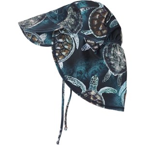 Sun hat with a UV protection of 50+, a wide brim and longer at the back of the neck to protect a child in the sun. The hat is blue with a turtle print. This Molo product is recycled and made from REPREVE reusable polyester. REPREVE is the leading, most trusted brand in reusable fibres and is made from used plastic bottles and other waste. The production of recycled polyester utilises far fewer resources and emits less CO2, making Molo’s recycled swimwear a sustainable choice.
