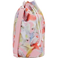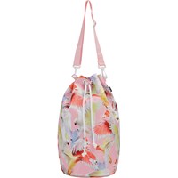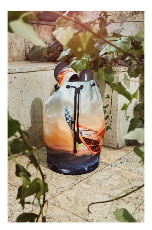 Large beach bag with a surf print. The bag is water repellent and has a cinched tie closure at the top and a strap. The bag is perfect for a day at the beach.