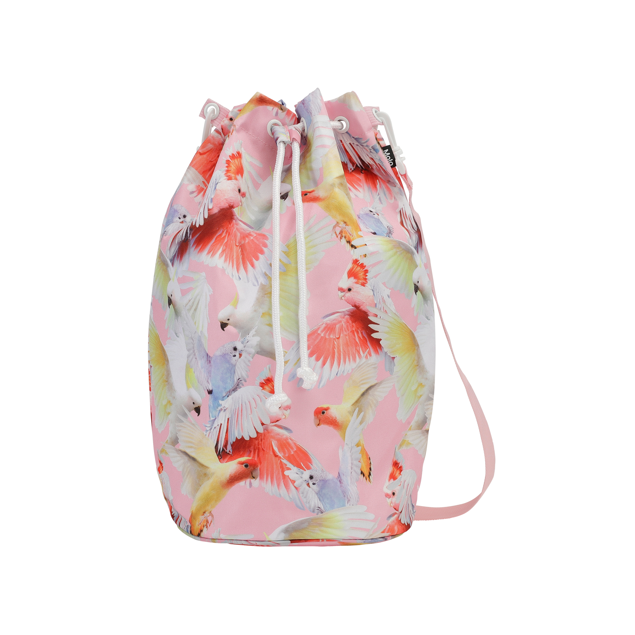 Large beach bag with a surf print. The bag is water repellent and has a cinched tie closure at the top and a strap. The bag is perfect for a day at the beach.