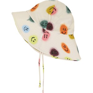 Sun hat with 50+ UV protection, a wide brim and longer on the back to best protect a child. The sun hat is in a rose colour with a print of different coloured smiley faces.