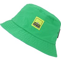 Blue, 2-in-1 bucket hat in nylon with a neon yellow Molo Swim label on the front. The hat is reversible, so it can be either dark blue or light blue.