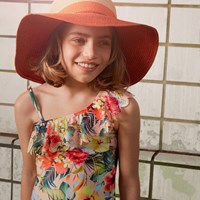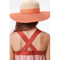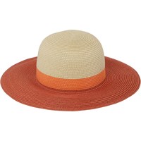 Large, wide-brimmed straw hat with a dark orange brim that protects against the sun's rays and is perfect for a trip to the beach.