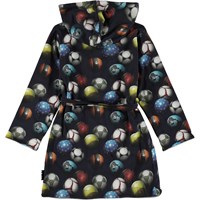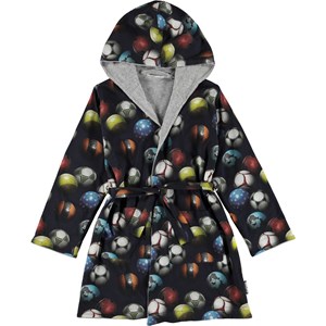 Wave is a soft bathrobe with a print of colourful footballs. It's lined in a lightweight, tightly woven terry cloth and has two pockets, ties at the waist, and it has a large hood to keep the head and neck extra warm.