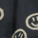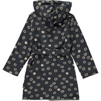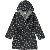 Soft dressing gown in blue with a print of smiley faces and peace signs. It is lined in a soft, lightweight terry, and it has two pockets, ties at the waist and has a large hood to keep the neck and head extra warm.