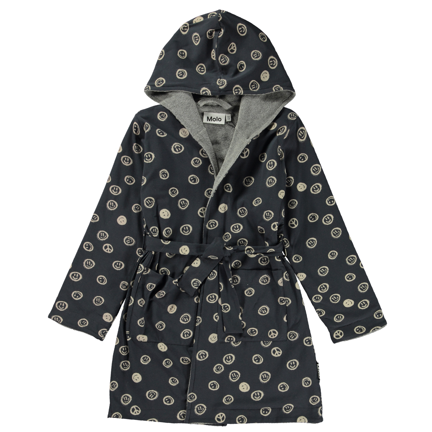 Soft dressing gown in blue with a print of smiley faces and peace signs. It is lined in a soft, lightweight terry, and it has two pockets, ties at the waist and has a large hood to keep the neck and head extra warm.