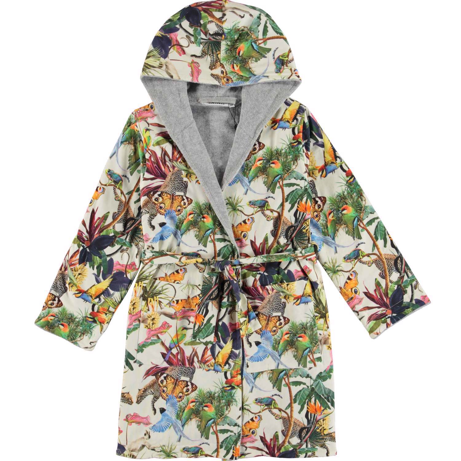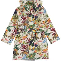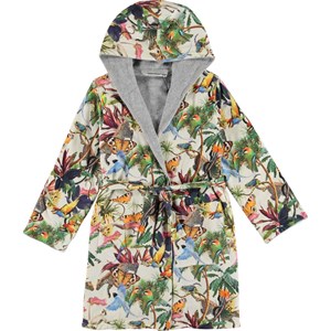 Soft, organic bathrobe with a print of a surrealistic fantasy jungle on a cream oloured background. It is lined in a soft, lightweight, tightly woven terry. It has two pockets, ties at the waist and a large hood to keep the neck and head extra warm.