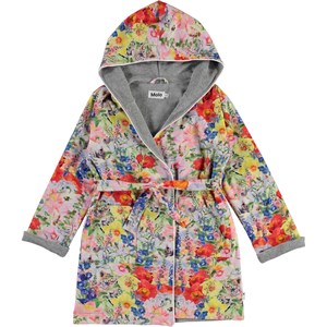 Soft bathrobe with a floral print. The bathrobe is lined in a soft, lightweight terry. It has two pockets, ties at the waist and a large hood to keep the neck and head extra warm.
