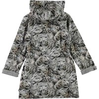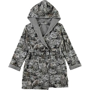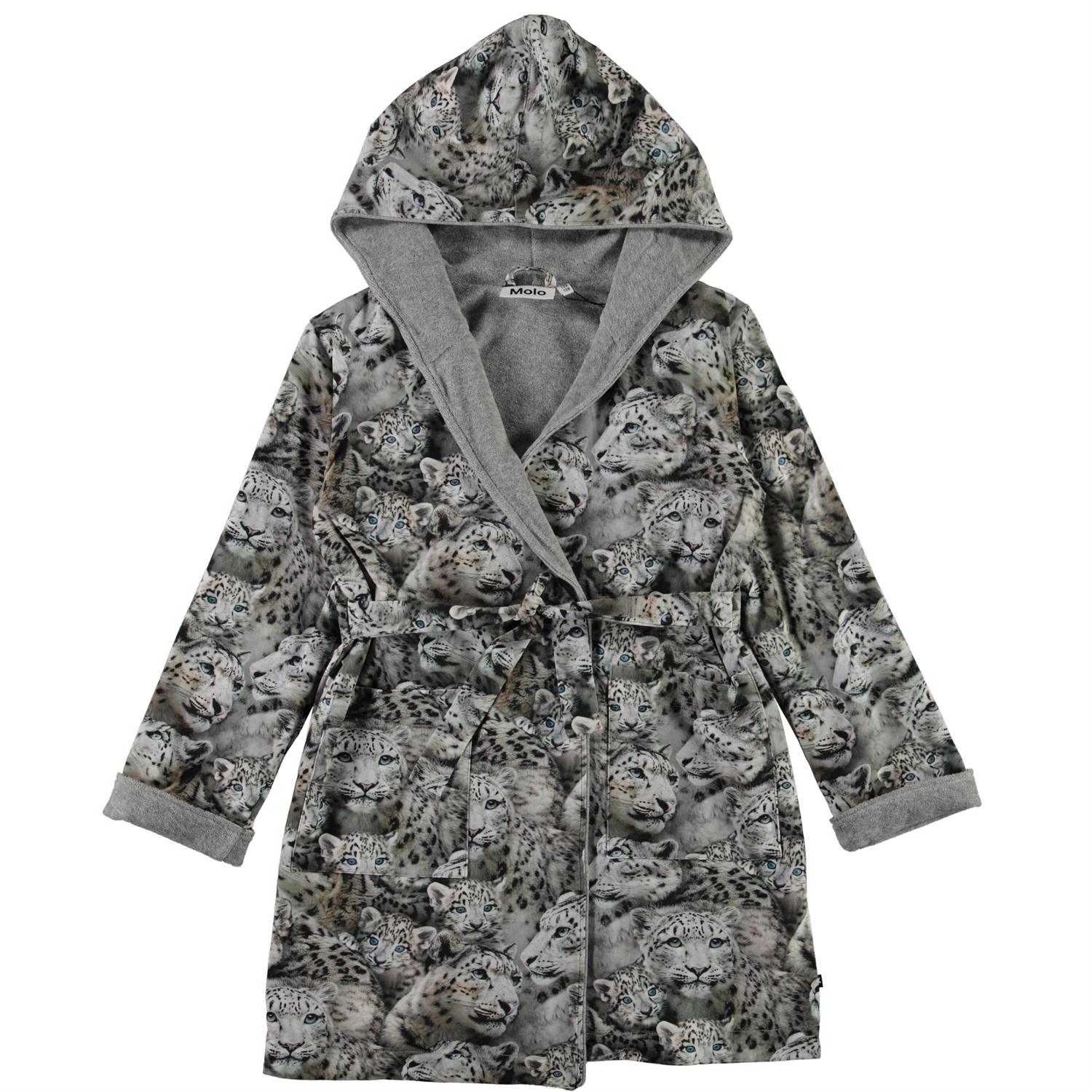 Soft bathrobe with a snow leopard print. It is lined in a soft, lightweight terry and has two pockets, ties at the waist and a large hood to keep the neck and head extra warm.