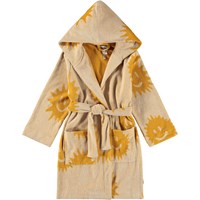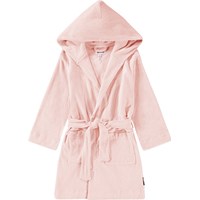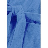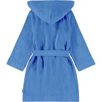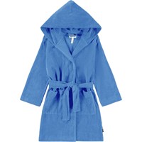 Blue bathrobe made of super soft, organic cotton terry. The bathrobe has two pockets, a waist tie, and a hood.