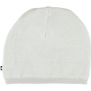 Light grey hat in a soft wool blend with intarsia stars and a rib at the bottom.